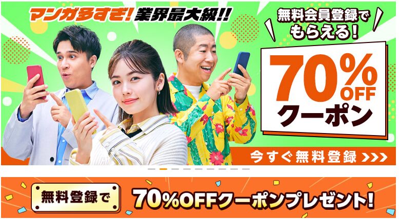 - コミックシーモア:初回70%OFFクーポン(上限2,000円)